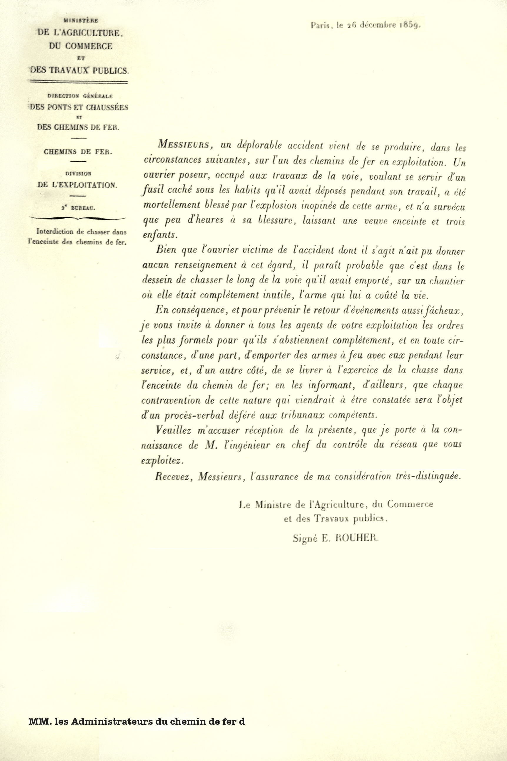 Circulaire ministère des travaux publics relative à l'interdiction de chasser 1859.