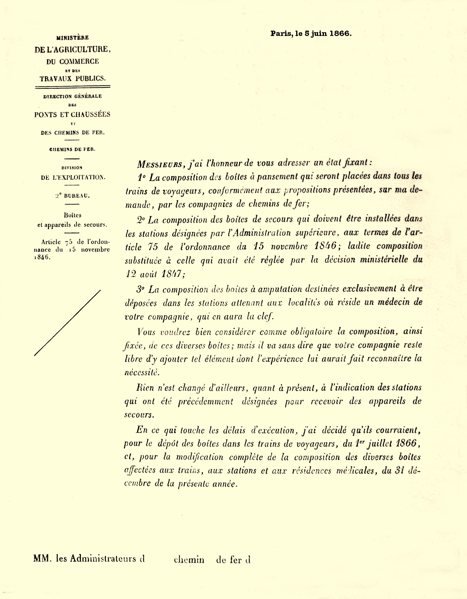 Arrêté ministériel relatif aux boîtes de secours 1866.
