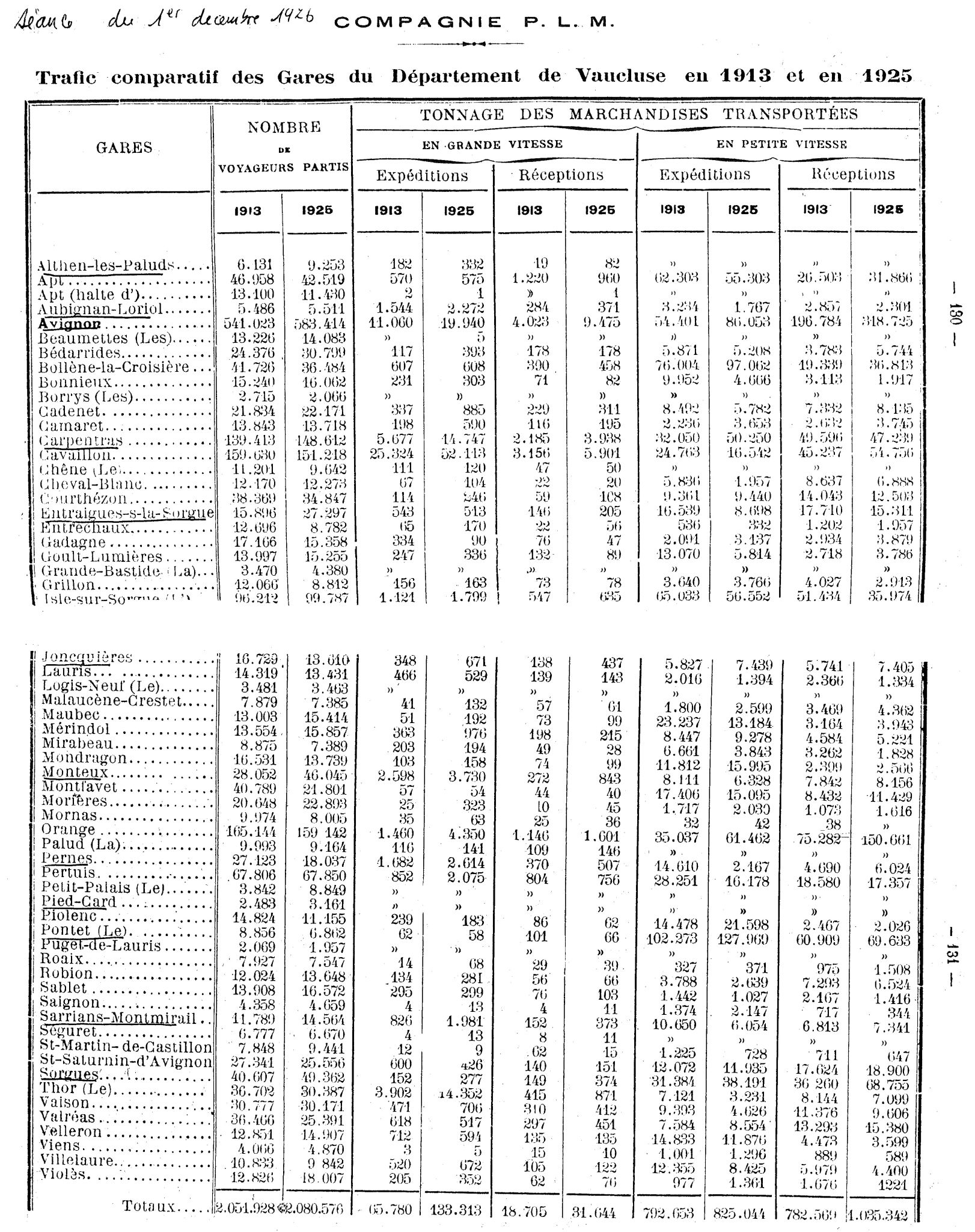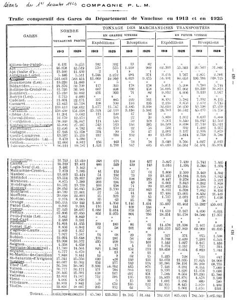 Statistiques produit comparatif 1913/1925 gares de Vaucluse